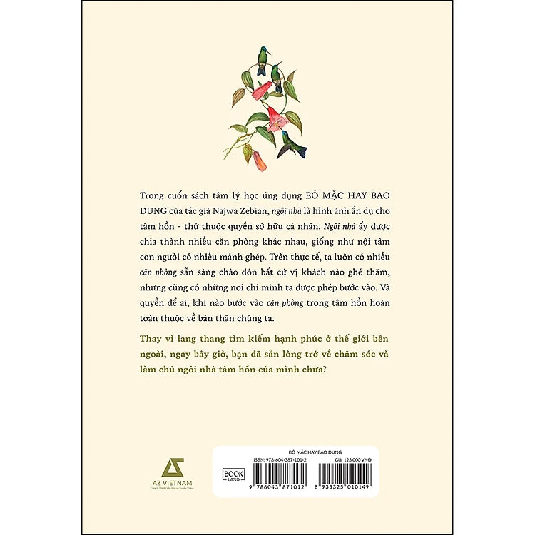 Trong cuốn sách tâm lý học ứng dụng BỎ MẶC HAY BAO DUNG của tác giả Najwa Zebian, “ngôi nhà” là hình ảnh ẩn dụ cho tâm hồn - thứ thuộc quyền sở hữu cá nhân. Ngôi nhà ấy được chia thành nhiều căn phòng khác nhau, giống như nội tâm con người có nhiều mảnh ghép. Trên thực tế, ta luôn có nhiều căn phòng sẵn sàng chào đón bất cứ vị khách nào ghé thăm, nhưng cũng có những nơi chỉ mình ta được phép bước vào. Và quyền để ai, khi nào bước vào căn phòng trong tâm hồn hoàn toàn thuộc về bản thân chúng ta.