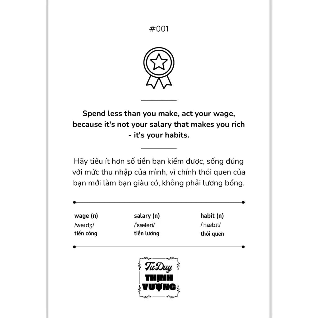 Cuốn sách chứa đựng những trích dẫn sâu sắc và truyền cảm hứng về tư duy thịnh vượng – từ cách bạn quản lý tài chính, làm giàu trí tuệ đến chăm sóc sức khỏe và hạnh phúc cá nhân. Những câu từ mạnh mẽ này giúp bạn suy ngẫm, thay đổi tư duy và từng bước tiến gần hơn đến cuộc sống mà bạn mong ước.
