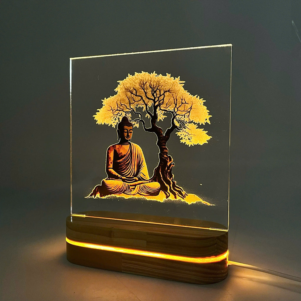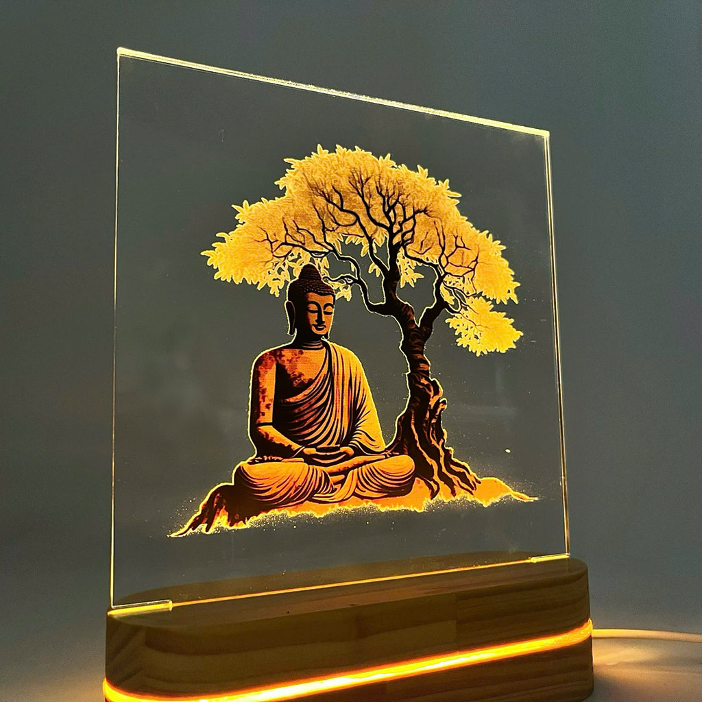 ✨ Hình ảnh Đức Phật được khắc trên mica trong suốt, kết hợp ánh sáng LED vàng ấm tạo hiệu ứng lung linh, trang nghiêm.