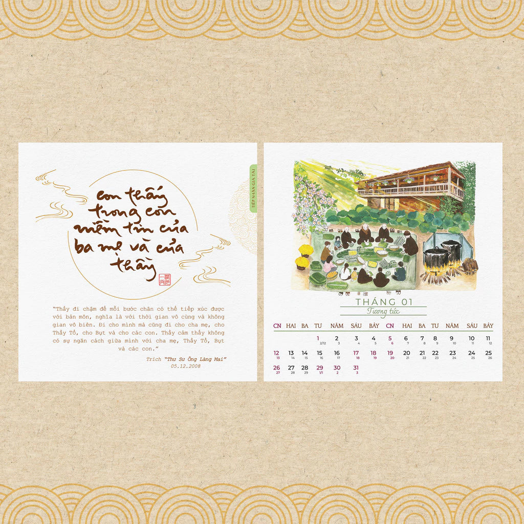 Bộ lịch thư pháp Làng Mai 2025 là sự tiếp nối tinh hoa từ giáo lý của Thiền sư Thích Nhất Hạnh. Qua mỗi trang lịch, quý độc giả sẽ được dẫn dắt bởi những câu thư pháp đầy ý nghĩa và sâu lắng, như những lời nhắc nhở nhẹ nhàng về việc sống trọn vẹn trong hiện tại. Tăng thân Làng Mai đã dày công chuẩn bị và gửi gắm tâm huyết của mình qua từng nét bút, nhằm mang đến cho mỗi người sự bình an, vững chãi giữa những khó khăn của cuộc sống.