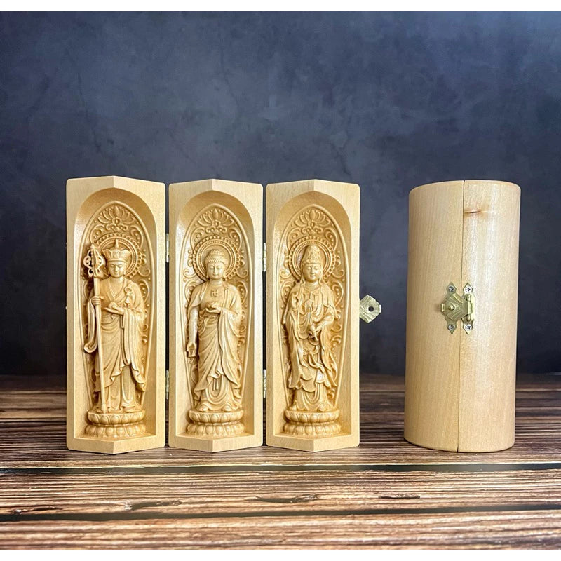 Bộ tượng gồm 3 tượng Địa Tạng bồ tát - Phật A di đà- Quan thế Âm Bồ tát được gắn với nhau bằng lề và khoá, giúp dể dàng đóng mở và thuận tiện trong việc gói gọn mang theo cùng hành lý trong những chuyến đi xa.