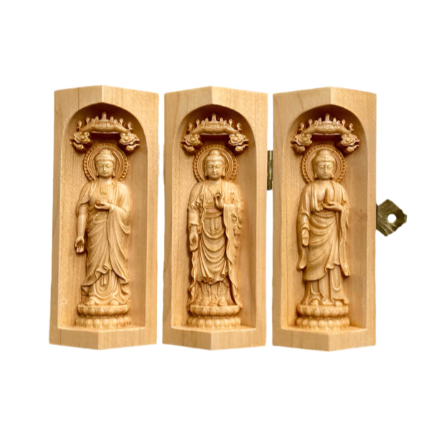Bộ tượng gồm 3 vị Phật: Phật A di Đà, Phật Thích ca và Dược sư lưu ly quang vương Phật. Kích thước của bộ tượng là cao 10cm, ngang khi mở là 13cm, đường kính hộp tròn khi đóng là 5cm. Tượng được ráp 3 mãnh tròn đều, bằng nhau. Chất liệu của bộ tượng là gỗ Maple nhập khẩu châu Âu, đảm bảo độ bền cao, đẹp và sang trọng.