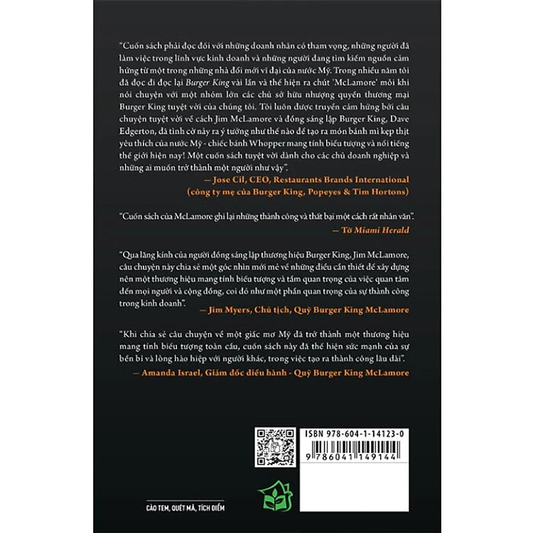 "Burger King - Câu Chuyện “tuyệt Ngon” Về Khởi Nghiệp Và Nhượng Quyền Kinh Doanh" được viết bởi James W. McLamore, đồng sáng lập và CEO của Burger King, về chính cuộc đời của ông - một biểu tượng kinh doanh toàn cầu. Có thể nói cuốn sách được viết theo lối truyền thống: bắt đầu từ tuổi thanh xuân của tác giả, cho đến khi gia nhập hải quân, hình thành nhân sinh quan, khởi nghiệp, tìm vốn, mở hoạt động nhượng quyền, cạnh tranh, phát triển, vượt chướng ngại, duy trì vị thế dẫn đầ Chính nhờ vậy mà cuốn sách trở nên dễ đọc. Nó giống như một câu chuyện thần thoại về một nhân vật lẫy lừng. Sách thể hiện ước mơ của những người trẻ lập nghiệp, những người muốn nghe về một câu chuyện họ thích nghe và muốn mình cũng là nhân vật trong câu chuyện đó. Sách có những đoạn tác giả bộc bạch suy tư khá thú vị.