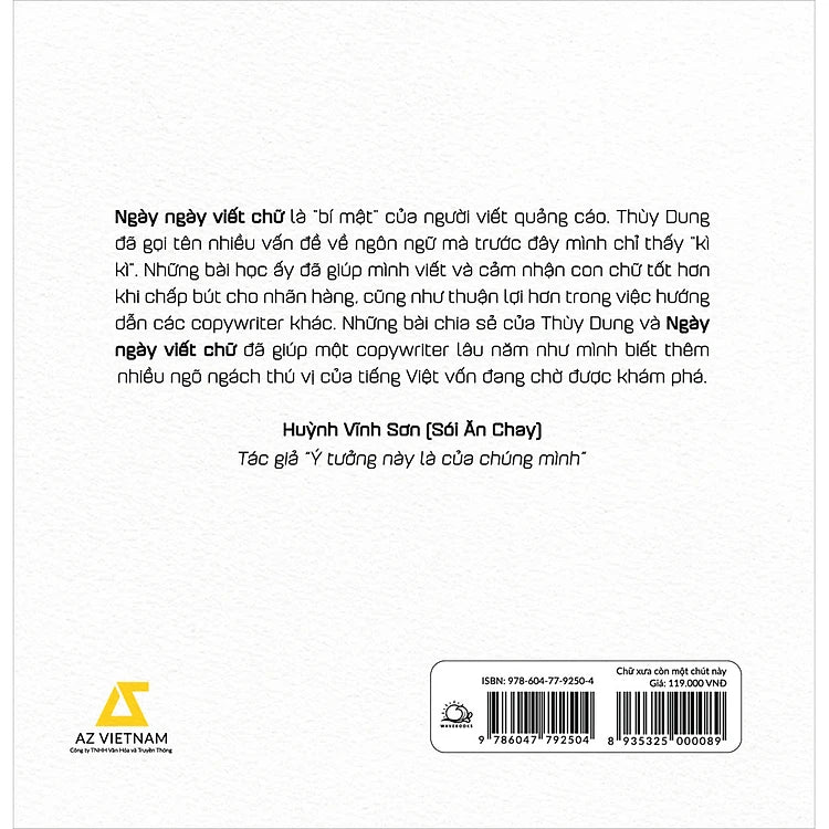 Ngày ngày viết chữ là "bí mật" của người viết quảng cáo. Thùy Dung đã gọi tên nhiều vấn đề về ngôn ngữ mà trước đây mình chỉ thấy "kì kì". Những bài học ấy đã giúp mình viết và cảm nhận con chữ tốt hơn khi chấp bút cho nhãn hàng, cũng như thuận lợi hơn trong việc hướng dẫn các copywriter khác. Những bài chia sẻ của Thùy Dung và Ngày ngày viết chữ đã giúp một copywriter lâu năm như mình biết thêm nhiều ngõ ngách thú vị của tiếng Việt vốn đang chờ được khám phá.” - nhận xét từ Huỳnh Vĩnh Sơn (Sói Ăn Chay) - Tác giả “Ý tưởng này là của chúng mình”
