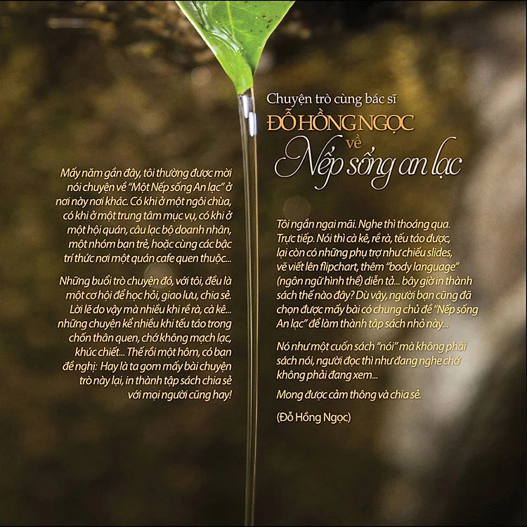 Tôi ngần ngại mãi. Nghe thì thoáng qua. Trực tiếp. Nói thì cà kê, rề rà, tếu táo được, lại còn có những phụ trợ như chiếu slides, vẽ viết lên flipchart, thêm "body language" (ngôn ngữ hình thể) diễn tả bây giờ in thành sách thế nào đây? Dù vậy, người bạn cũng đã chọn được mấy bài có chung chủ đề "Nếp sống An lạc" để làm thành tập sách nhỏ này