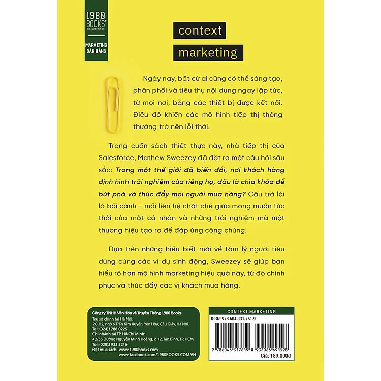 Trong cuốn sách thiết thực này, nhà tiếp thị của Salesforce Mathew Sweezey đã đặt ra một câu hỏi: Trong một thế giới đã biến đổi, nơi khách hàng định hình trải nghiệm của chính họ, đâu là chìa khóa để bứt phá và thúc đẩy họ mua hàng? Câu trả lời là bối cảnh - mối liên hệ chặt chẽ giữa mong muốn tức thời của một cá nhân và những trải nghiệm mà một thương hiệu tạo ra để đáp ứng công chúng. Dựa trên nghiên cứu và những hiểu biết mới về tâm lý người tiêu dùng hiện tại, Sweezey xác định năm yếu tố chính của bối cảnh. Trải nghiệm của khách hàng phải: