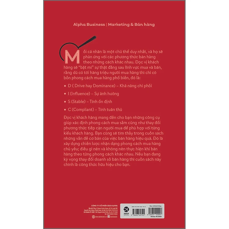 Tác phẩm được viết dưới dạng những mẩu hội thoại cởi mở và gói gọn trong một số chương ngắn, dễ đọc. Đọc vị khách hàng mang đến cho bạn những công cụ giúp định hình sở thích mua sắm cũng như biến đổi phương thức tiếp cận khách hàng để phù hợp với từng kiểu khách hàng. Bạn sẽ tìm thấy trong cuốn sách: Các chiến lược nhận dạng phong cách mua hàng chủ yếu; Nguyên nhân khiến mỗi nhân viên bán hàng lựa chọn một phong cách bán hàng khác nhau; Điều gì nên và không nên thực hiện khi bán hàng theo từng phong cách; Những sai lầm điển hình khi nhân viên bán hàng theo những phong cách khác nhau; Những dấu hiệu cho thấy bạn đang sử dụng sai phương thức bán hàng.