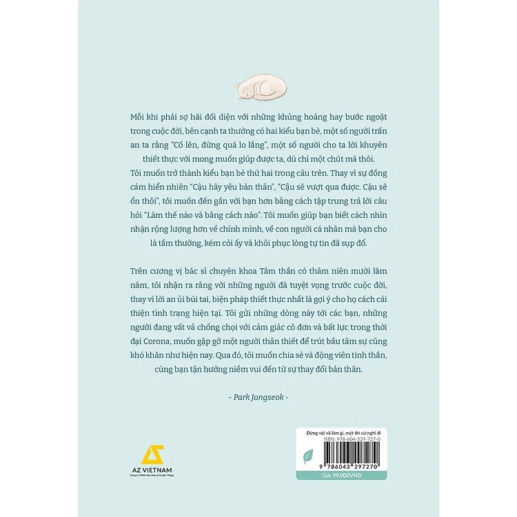 Đây cũng là lý do khiến tôi quyết tâm viết cuốn sách này. Tôi gửi những dòng này tới các bạn, những người đang vất vả chống chọi với cảm giác cô đơn, u uất, mệt mỏi, bất lực trong thời đại Corona, ngay cả việc gặp gỡ một người bạn thân thiết để trút bầu tâm sự cũng khó khăn như hiện nay. Qua đó, tôi muốn chia sẻ và động viên tinh thần, cùng bạn tận hưởng niềm vui đến từ sự thay đổi bản thân. Bác sĩ chuyên khoa Tâm thần Park Jongseok.