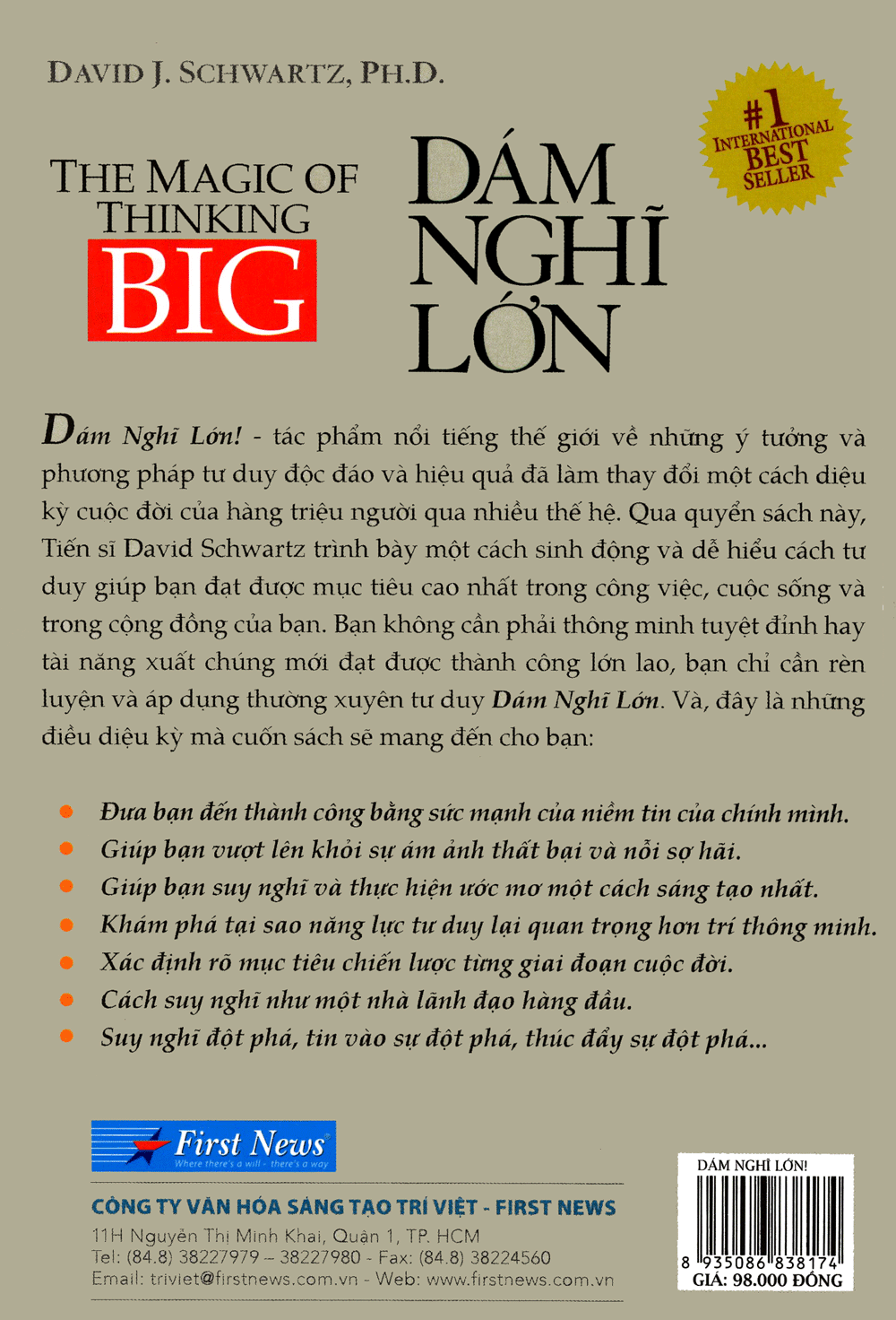Dám Nghĩ Lớn! – tác phẩm nổi tiếng thế giới về những ý tưởng và phương pháp tư duy độc đáo và hiệu quả đã làm thay đổi một cách kỳ diệu cuộc đời của hàng triệu người qua nhiều thế hệ. Qua quyển sách này, Tiến sĩ David Schwartz trình bày một cách sinh động và dễ hiểu cách tư duy giúp bạn đạt được mục tiêu cao nhất trong công việc, cuộc sống và trong cộng đồng của bạn. Bạn không cần phải thông minh tuyệt đỉnh hay tài năng xuất chúng mới đạt được thành công lớn lao, bạn chỉ cần rèn luyện và áp dụng thường xuyên tư duy Dám Nghĩ Lớn. Và đây là những điều diệu kỳ mà cuốn sách sẽ mang đến cho bạn:
