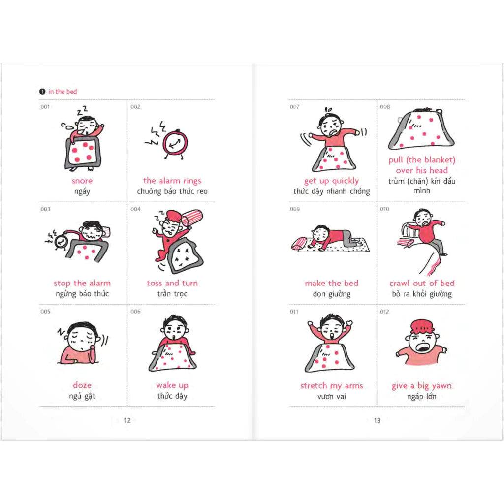 Sách hướng dẫn bạn học tiếng Anh theo từng bước: nhìn hình minh họa và ghi nhớ từ/cụm từ tiếng Anh kèm nghĩa tiếng Việt, học cách dùng từ/cụm từ trong câu (mục Sentence) và trong đoạn đối thoại (mục Dialogue), cuối cùng là dùng các từ/cụm từ đã học để viết câu.