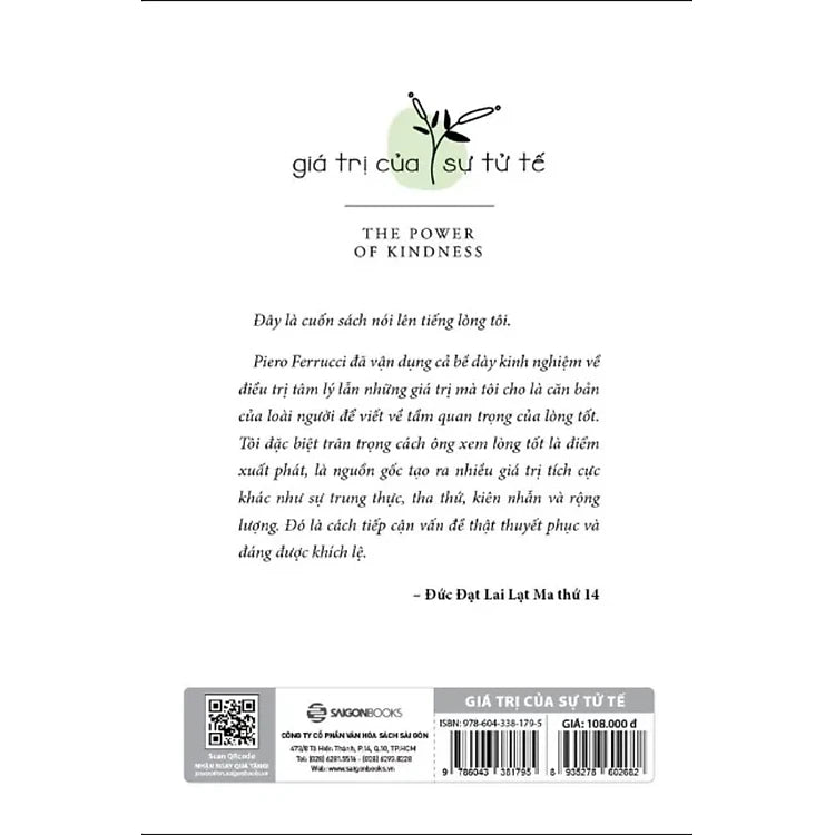 Việc cố gắng tạo ra điều gì đó tích cực trong cuộc sống là điều vô cùng quan trọng. Chúng ta không được sinh ra để gây rắc rối và làm hại người khác. Như Piero Ferrucci đã trình bày một cách đầy đủ và mạch lạc trong cuốn sách Giá trị của sự tử tế này, để cuộc sống thật sự có giá trị, ta cần củng cố và nuôi dưỡng những giá trị cơ bản của con người như sự nhiệt thành, lòng tốt và sự đồng cảm. Nếu làm được điều đó, cuộc sống của chúng ta sẽ trở nên có ý nghĩa, hạnh phúc và bình an hơn, đồng thời sẽ góp một phần tích cực vào thế giới quanh mình.