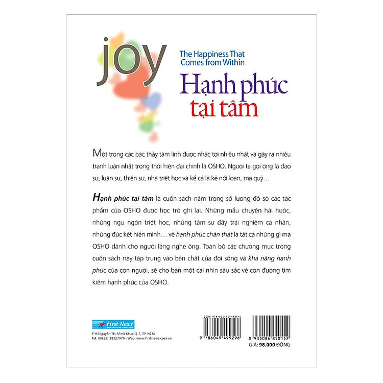 Hạnh phúc tại tâm - quyển sách sẽ giúp bạn hiểu rằng hạnh phúc không ở đâu xa mà ở ngay bên trong con người bạn. Với những lý giải tinh tế của, Osho sẽ giúp bạn đọc có những trải nghiệm thật thú vị khi đọc quyển sách này, hệt như bạn đang được nói chuyện với chính mình - một cách thông minh nhất.