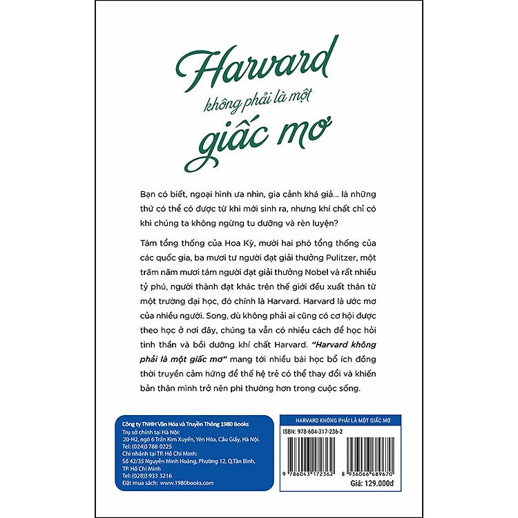 Tám tổng thống của Hoa Kỳ, mười hai phó tổng thống của các quốc gia, ba mươi tư người đạt giải thưởng Pulitzer, một trăm năm mươi tám người đạt giải thưởng Nobel và rất nhiều tỷ phú, người thành đạt khác trên thế giới đều xuất thân từ một trường đại học, đó chính là Harvard. Harvard là ước mơ của nhiều người. Song, dù không phải ai cũng có cơ hội được theo học ở nơi đây, chúng ta vẫn có nhiều cách để học hỏi tinh thần và bồi dưỡng khí chất Harvard. “Harvard không phải là một giấc mơ” mang tới nhiều bài học bổ ích đồng thời truyền cảm hứng để thế hệ trẻ có thể thay đổi và khiến bản thân mình trở nên phi thường hơn trong cuộc sống.
