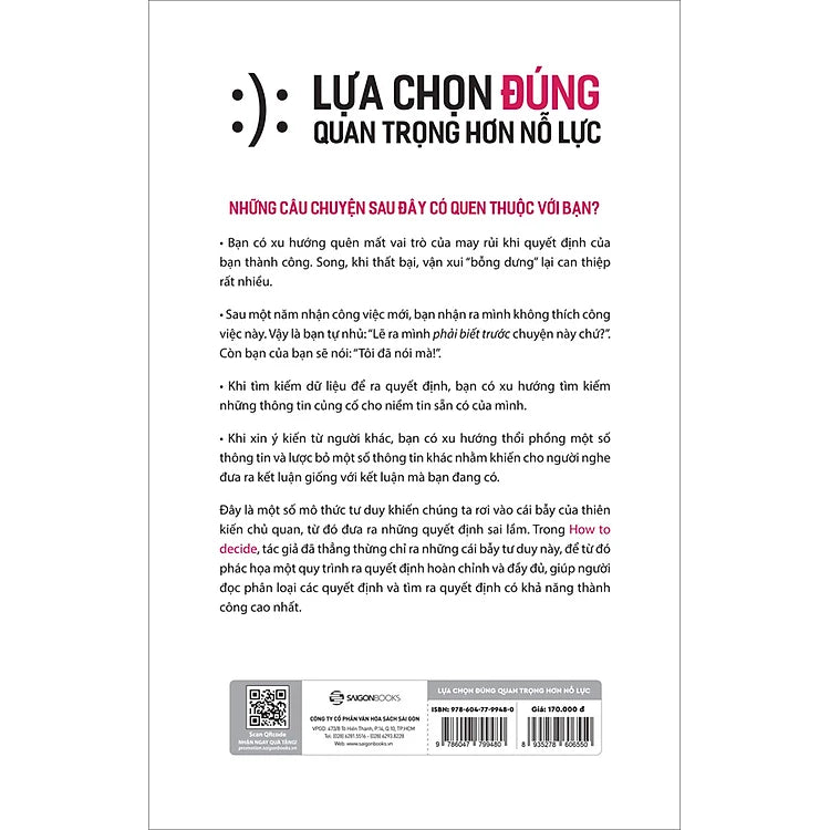 Nếu bạn nhìn nhận lại trong cuộc sống của mình cũng như những quan sát những người xung quanh, bạn sẽ thấy chúng ta rất dở trong việc lý giải những gì diễn ra đằng sau một quyết định có chất lượng, từ việc chúng ta lựa chọn trường đại học, cho đến những chỗ làm đầu tiên sau khi ra trường. Thậm chí khi hỏi các giám đốc điều hành – những người làm công việc ra quyết định, theo đúng nghĩa đen – rằng một quy trình ra quyết định chất lượng là gì, câu trả lời mà chúng ta nhận được thường khá mơ hồ: “Tôi chủ yếu tin vào trực giác của mình”, “Tôi đồng thuận với sự nhất trí của hội đồng”, “Tôi cân nhắc các phương án bằng cách lập danh sách ưu-nhược điểm”. Và đây là lý do bạn đọc cuốn sách này.