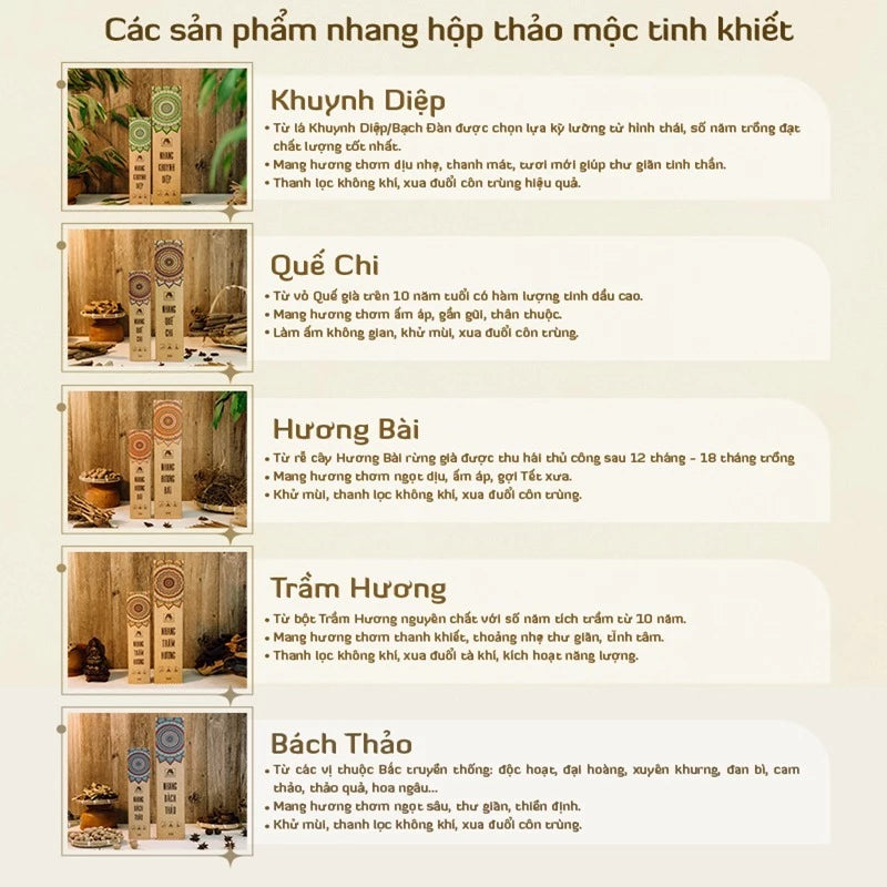 Nén nhang thảo mộc tinh khiết giữ vẹn nguyên hương thơm thảo mộc nguyên bản, đánh thức các giác quan một cách tinh tế, để hương thơm lan tỏa ngay khi vừa mở hộp. Một hương thơm dịu nhẹ, lan xa, lưu hương lâu trong không gian.
