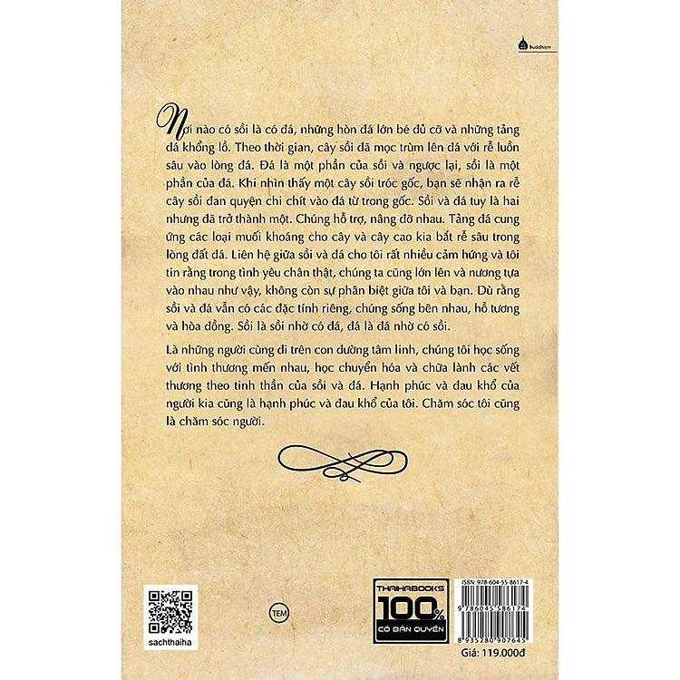 Nơi nào có sồi là có đá, những hòn đá lớn bé đủ cỡ và những tảng đá khổng lồ. Theo thời gian, cây sồi đã mọc trùm lên đá với rễ ồn sâu vào lòng đá. Đá là một phần của sồi và ngược lại, sồi là một phần của đá. Khi nhìn thấy một cây sồi tróc gốc, bạn sẽ nhận ra rễ cây sồi đan quyện chi chít vào đá từ trong gốc. Sồi và đá tuy là hai nhưng đã trở thành một. Chúng hỗ trợ, nâng đỡ nhau. Tảng đá cung ứng các loại muối khoáng cho cây và cây cao kia bắt rễ sâu trong lòng đất đá. Liên hệ giữa sồi và đá cho tôi rất nhiều cảm hứng và tôi tin rằng trong tình yêu chân thật, chúng ta cũng lớn lên và nương tựa vào nhau như vậy, không còn sự phân biệt giữa tôi và bạn. Dù rằng sồi và đá vẫn có các đặc tính riêng, chúng sống bên nhau, hỗ tương và hòa đồng. Sồi là sồi nhờ có đá, đá là đá nhờ có sồi.