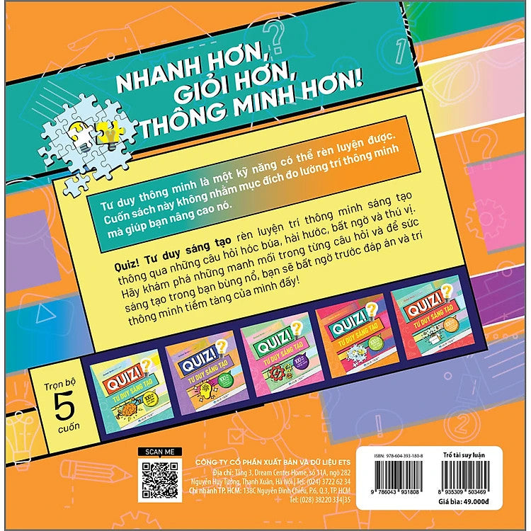 Và Bộ sách Quiz! Tư duy sang tạo không nhằm mục đích đo lường trí thông minh mà giúp bạn nâng cao một trong chín loại trí thông minh của con người. Hy vọng thông qua cuốn sách này, bạn sẽ thông minh hơn và thành công hơn trong cuộc sống.