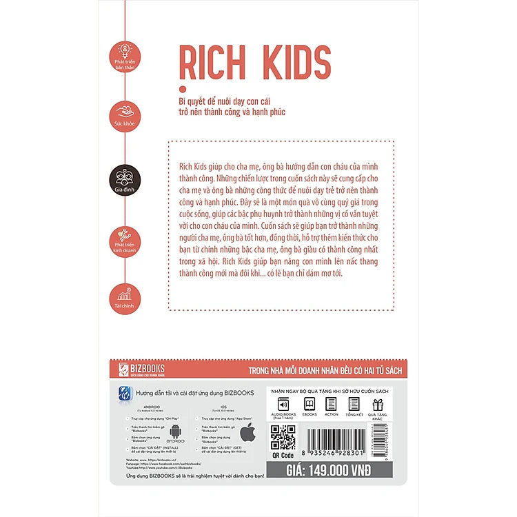 Cuốn sách sẽ giúp bạn trở thành những người cha mẹ, ông bà tốt hơn, đồng thời, hỗ trợ thêm kiến thức cho bạn từ chính những bậc cha mẹ, ông bà giàu có thành công nhất trong xã hội. Rich Kids giúp bạn nâng con mình lên nấc thang thành công mới mà đôi khi có lẽ bạn chỉ giám mơ tới.