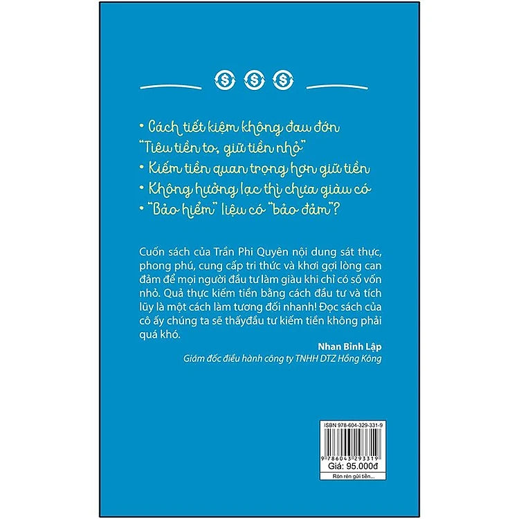 Cuốn sách của Trần Phi Quyên nội dung sát thực, phong phú, cung cấp tri thức và khơi gợi lòng can đảm để mọi người đầu tư làm giàu khi chỉ có số vốn nhỏ. Quả thực kiếm tiền bằng cách đầu tư và tích lũy là một cách làm tương đối nhanh! Đọc sách của cô ấy chúng ta sẽ thấy đầu tư kiếm tiền không phải là quá khó.