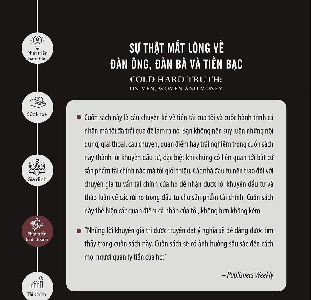 Cuốn sách đặc biệt của tác giả Kevin O’Leary “ Sự thật mất lòng về đàn ông, đàn bà và tiền bạc” giống như một cẩm nang để các cặp vợ chồng hay những bạn nào chuẩn bị bước vào hôn nhân có những suy nghĩ và hành động thật thông minh trong mối quan hệ vợ chồng với tiền bạc. Mục tiêu của tác giả: cung cấp cho bạn những phương pháp thực tế nhằm tiết kiệm tiền, đầu tư tốt hơn và giảm chi phí – ở mọi giai đoạn trong cuộc đời bạn, từ khi bạn sinh ra cho đến khi bạn nằm xuống. Chính tác giả sẽ chỉ cho bạn cách dạy con cái nhạy bén với tiền bạc, để chúng không tiêu pha lãng phí hay rơi vào cảnh nợ nần quá sớm.