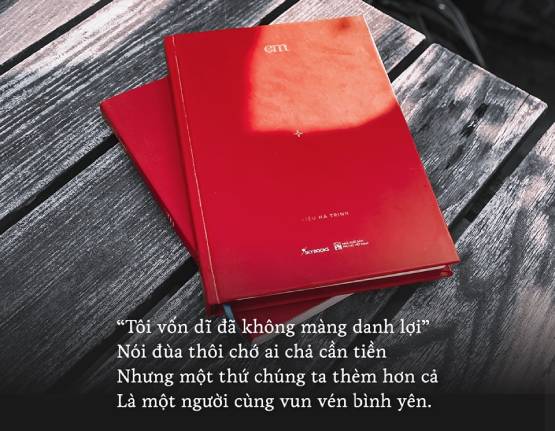 Bởi trong "Em" - Liêu Hà Trinh, bằng những dòng tản văn sắc sảo, nội lực… đến những vần thơ tràn đầy tính nữ, sẽ khéo léo, tinh tế dẫn dắt bạn cởi bỏ những bí mật giấu kín, bóc tách những gai góc đơn độc, lắng nghe những rung động mạnh mẽ trong tim mình bằng cách chậm chậm chạm tới và sẻ chia. Từ cảm xúc hoang sơ khi tim vừa biết vỡ, choáng ngợp trái dấu tuổi đôi mươi, đến chơi vơi của tuổi 30 nhiều trăn trở và mâu thuẫn. Để rồi gửi gắm lời động viên thân mật tự đáy lòng, xoa dịu tất cả bất an chôn giấu, cùng "em" bước qua từng bướt ngoặt thăng trầm của cuộc sống,