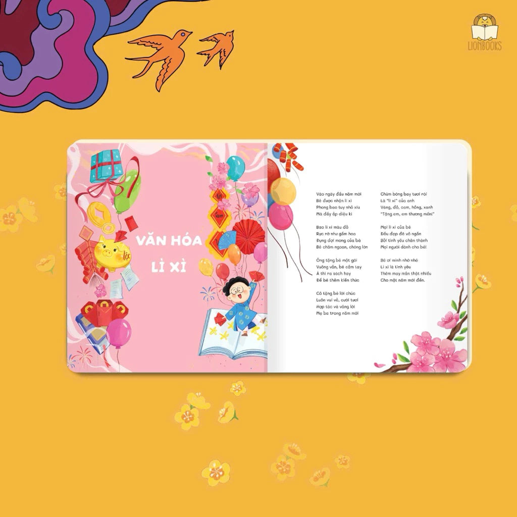 ☘️Cuốn sách đưa bé dạo một vòng quanh những ngày cuối năm rộn ràng: từ lúc cả nhà tất bật chuẩn bị, cho đến khoảnh khắc sum vầy, đoàn tụ trong những ngày đầu xuân. Mỗi vùng miền có cách đón Tết thật riêng như: nơi gói bánh chưng, nơi làm bánh tét, nơi chưng đào, nơi cắm mai… nhưng điều không bao giờ thay đổi chính là tình yêu thương của gia đình lớn và niềm vui khi được trở về nhà.
