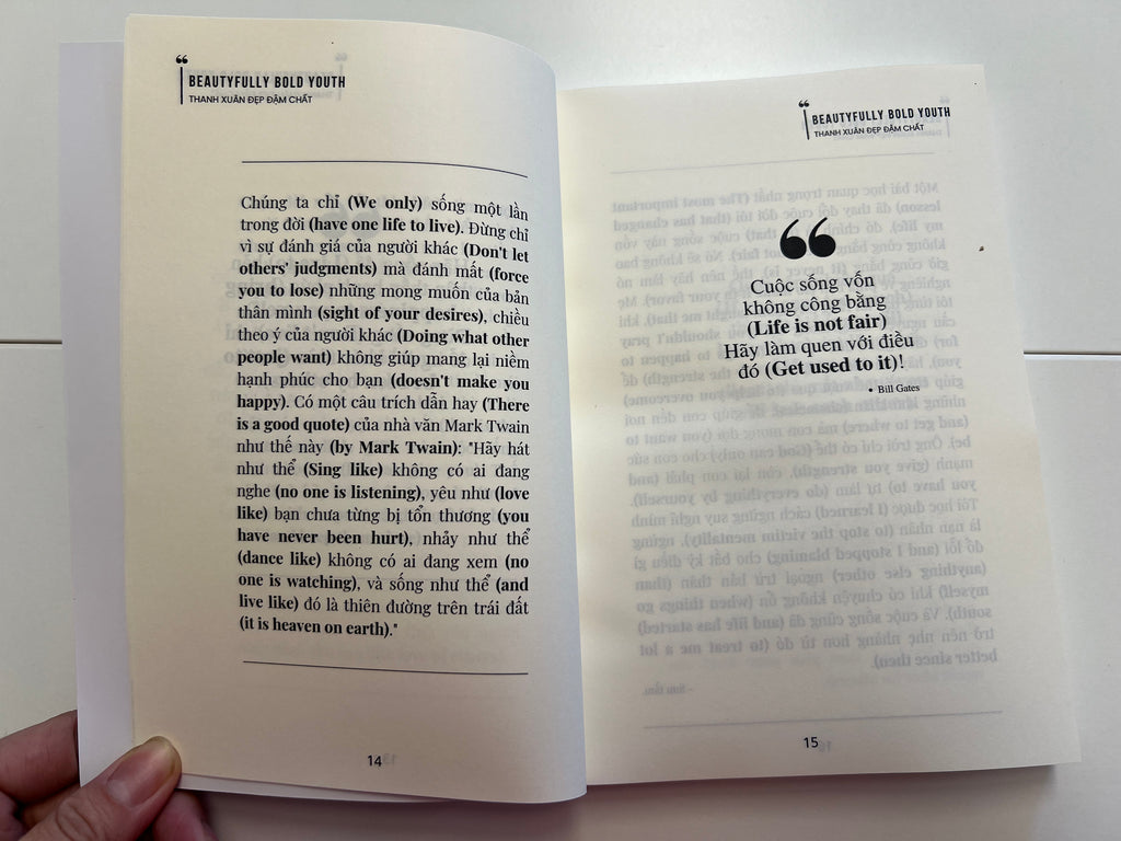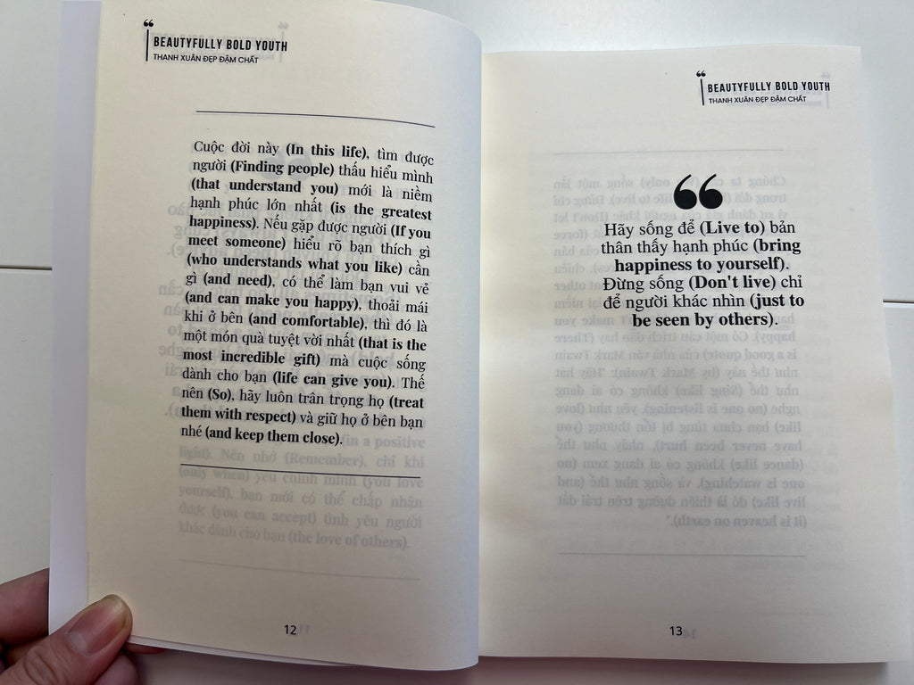 - Trích dẫn song ngữ xen kẽ Việt - Anh về tuổi thanh xuân, tình yêu tuổi trẻ và câu chuyện bài học cuộc sống giàu cảm xúc, chữa lành bản thân.