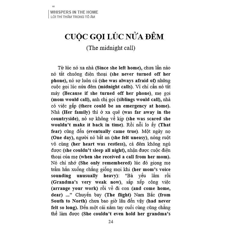 "Lời Thì Thầm Trong Tổ Ấm" là một cuốn sách song ngữ Anh-Việt, giúp người đọc cải thiện kỹ năng tiếng Anh thông qua việc đọc song ngữ. Nội dung sách tập trung vào những câu chuyện gia đình, tình cảm và những bài học cuộc sống, được trình bày song song bằng cả tiếng Anh và tiếng Việt, giúp người học dễ dàng so sánh và hiểu nghĩa của từ vựng cũng như cấu trúc câu.