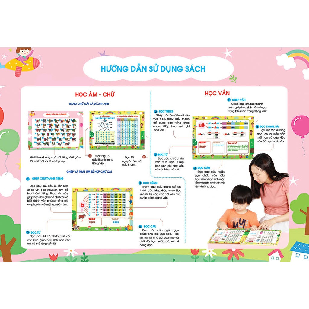 Sách được thiết kế theo phương pháp sơ đồ Tư duy (Mind maps), các vần, từ tiếng Việt đầy đủ, giúp bé nhận dạng chữ cái và ghép vần, bố mẹ cũng rất dễ dàng hướng dẫn con học tập đúng cách. Sách được cấu trúc khoa học, gồm 3 phần: Học Âm - Chữ; Học Vần; Luyện đọc