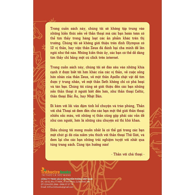 Tác phẩm kể lại những mẩu chuyện có phần khác lạ và ít người biết đến của các hệ thống thần thoại nổi tiếng như: Hy Lạp, Bắc Âu, Ai Cập, Celtic và Nhật Bản. Bên cạnh đó, tác phẩm còn có bổ sung một vài các chi tiết bên lề thú vị cho độc giả, đồng thời đưa ra cảm nghĩ cũng như nhận xét của nhóm tác giả và đưa cho chúng ta một cái nhìn toàn diện hơn về các vị thần. Tác phẩm gồm 6 chương lớn bao gồm Hy Lạp, Bắc Âu, Ai Cập, Celtic và một phần Phụ lục kèm các tranh vẽ cổ điển có chủ đề về các câu chuyện trong thần thoại Hy Lạp.