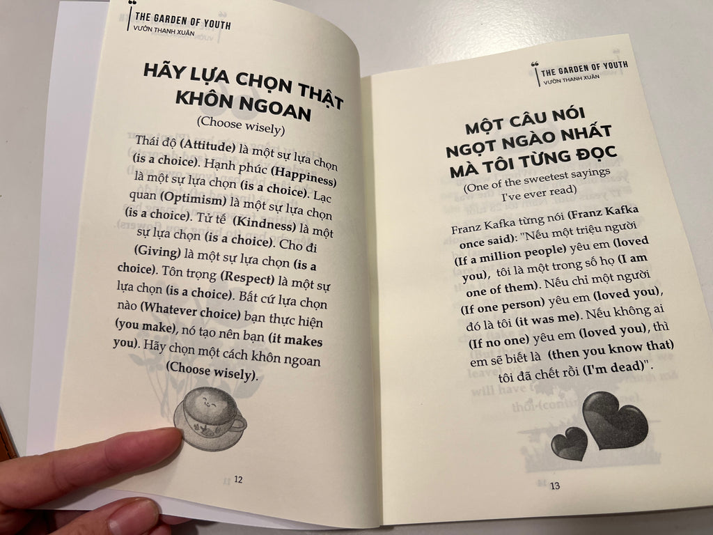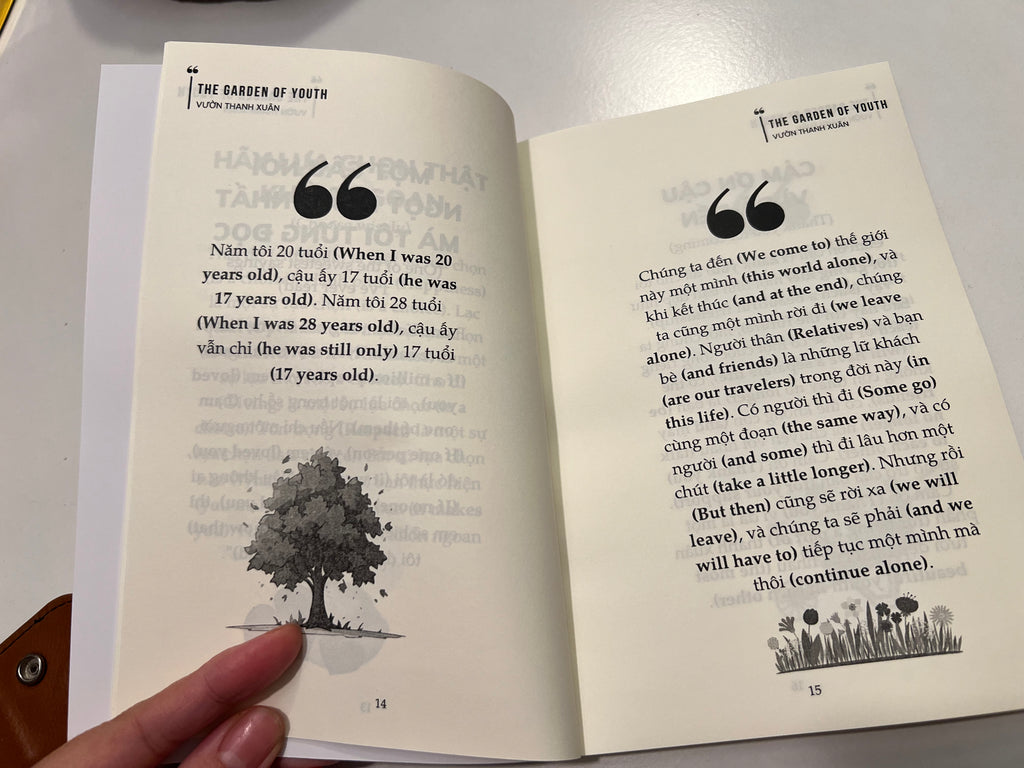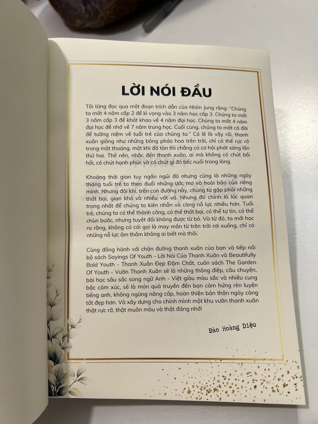 ”Cuốn sách The Garden Of Youth - Vườn Thanh Xuân sẽ là những thông điệp, câu chuyện, Bài học sâu sắp song ngữ Anh - Việt giàu màu sắc và nhiều cung bậc cảm xúc, sẽ là món quà truyền đến bạn cảm hứng rèn luyện tiếng Anh, không ngừng nâng cấp, hoàn thiện bản thân ngày càng tốt đẹp hơn. Và xây dựng cho chính mình một khu vườn thanh xuân thật rực rỡ, thật muôn màu và thật đáng nhớ"