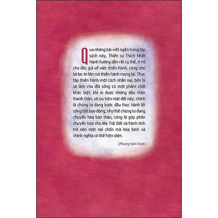 Qua những bài viết ngắn trong tập sách này, Thiền sư Thích Nhất Hạnh hướng dẫn rất cụ thể, tỉ mỉ cho độc giả về việc thiền hành, cũng như lợi lạc to lớn mà thiền hành mang lại. Thực tập thiền hành một cách nhẫn nại, bền bỉ sẽ làm cho đời sống có một phẩm chất khác biệt; khi in được những dấu chân thanh thản, vô ưu trên mặt đất này, chính là chúng ta đang bước đầu thực hành lối sống bất bạo động, như thể chúng ta đang chuyển hóa bản thân, cũng là góp phần chuyển hóa cho mẹ Trái Đất và hành tinh trở nên một nơi chốn mà hòa bình và chính nghĩa có thể hiện diện.
