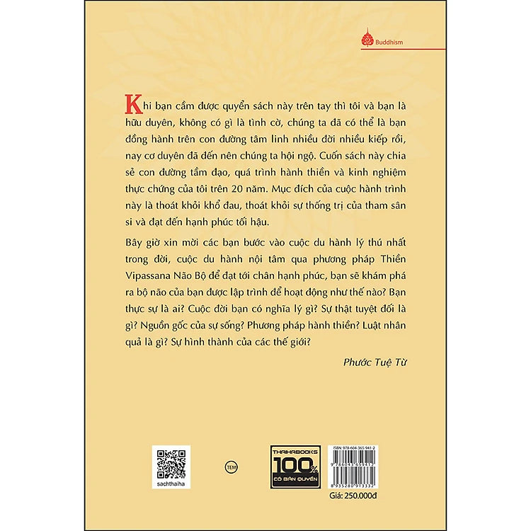Bây giờ xin mời các bạn bước vào cuộc du hành lý thú nhất trong đời bạn, cuộc du hành nội tâm qua phương pháp Thiền Vipassana Não Bộ để đạt tới chân hạnh phúc, bạn sẽ khám phá ra bộ não của bạn được lập trình để hoạt động như thế nào? Bạn thực sự là ai? Cuộc đời bạn có nghĩa lý gì? Sự thật tuyệt đối là gì? Nguồn gốc của sự sống? Phương pháp hành thiền? Luật nhân quả là gì? Sự hình thành của các thế giới?