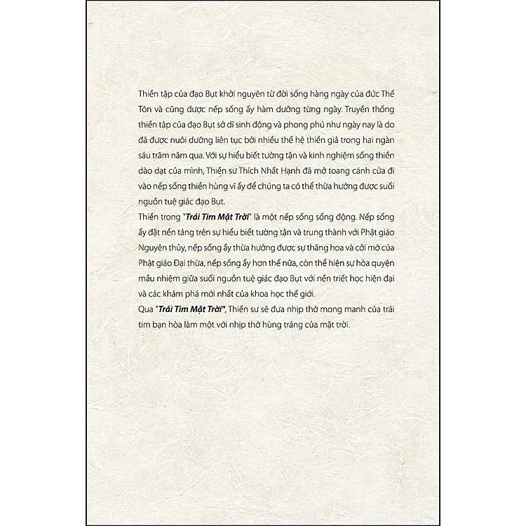 Thiền trong Trái Tim Mặt Trời là một nếp sống sống động. Nếp sống ấy đặt nền tảng trên sự hiểu biết tường tận và trung thành với Phật giáo Nguyên thủy, nếp sống ấy thừa hưởng được sự thăng hoa và cởi mở của Phật giáo Đại thừa, nếp sống ấy hơn thế nữa, còn thể hiện sự hòa quyện mầu nhiệm giữa suối nguồn tuệ giác đạo Bụt với nền triết học hiện đại và các khám phá mới nhất của khoa học thế giới.