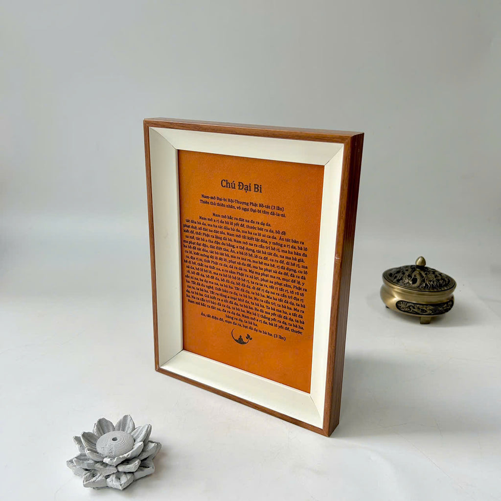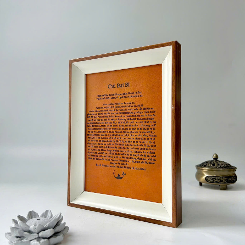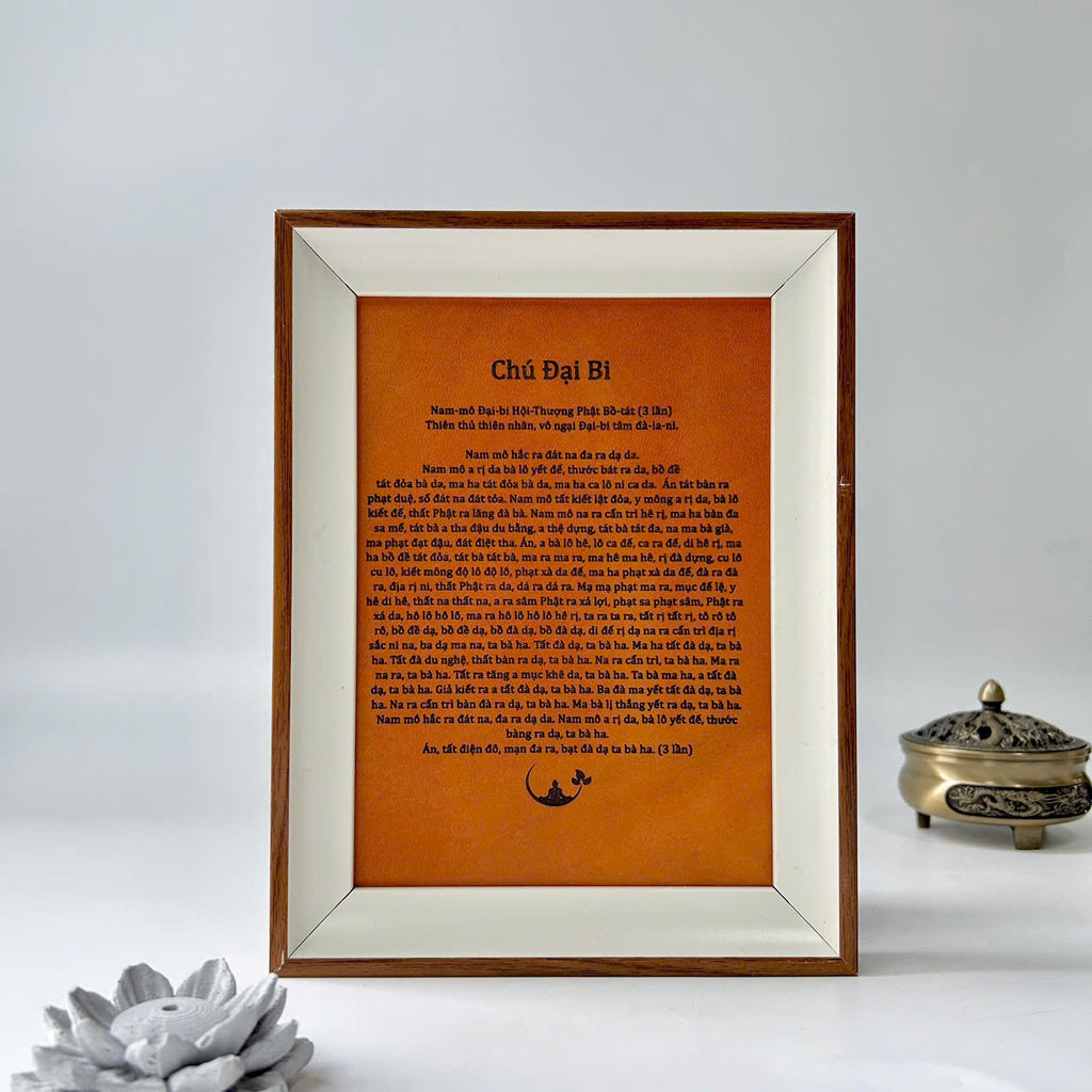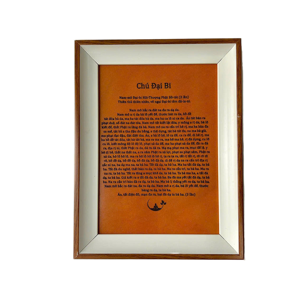 Tranh Da Phật Giáo – Chú Đại Bi được chế tác từ da cao cấp, kết hợp khung gỗ sang trọng, khắc rõ ràng toàn văn Chú Đại Bi – một trong những thần chú linh thiêng nhất của Phật giáo.