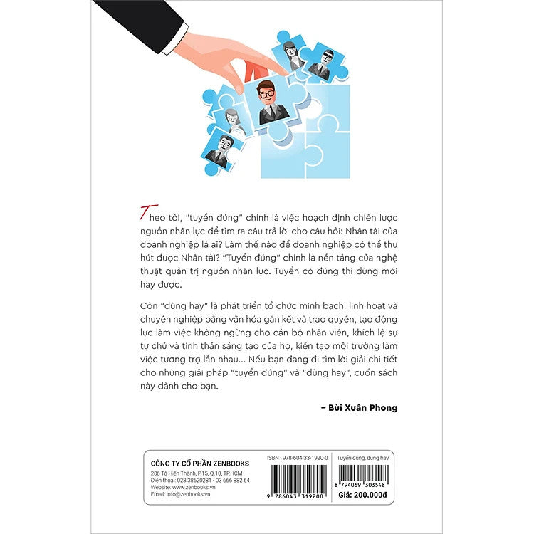 Còn thế nào là “dùng hay”? Theo tác giả, biểu hiện quan trọng nhất của khái niệm “dùng hay” là phát triển tổ chức minh bạch, linh hoạt và chuyên nghiệp bằng văn hóa gắn kết và trao quyền, từ đó tạo động lực làm việc không ngừng cho cán bộ nhân viên, khích lệ sự tự chủ và tinh thần sáng tạo của họ. “Dùng hay” là kiến tạo môi trường làm việc tương trợ lẫn nhau mà ở đó, tâm lý và hành vi của người lao động được thấu hiểu, chất lượng đời sống của họ được nâng cao, đồng thời các cơ hội phát triển nghề nghiệp được mở ra để khích lệ và nuôi dưỡng tình yêu nghề của họ. Nếu bạn đang đi tìm lời giải chi tiết cho những giải pháp “tuyển đúng” và “dùng hay” ấy thì cuốn sách này dành cho bạn.