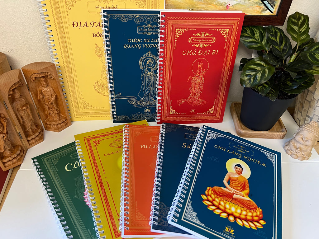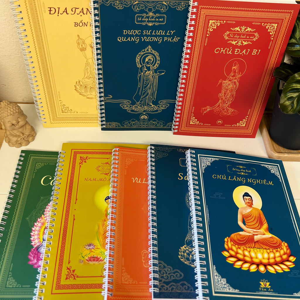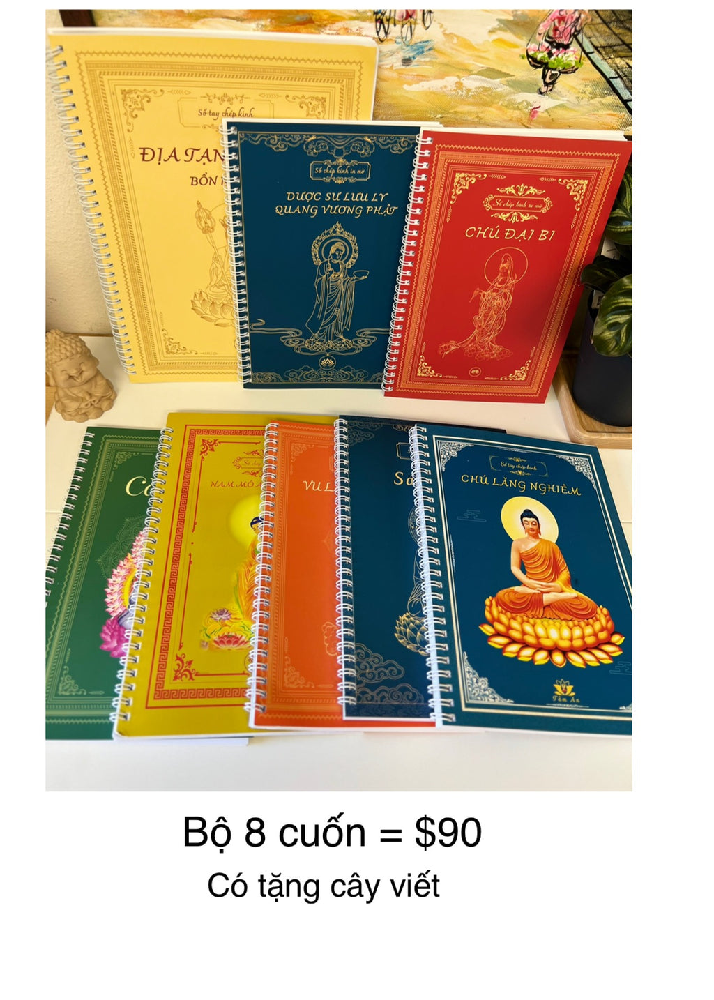Bộ 8 cuốn vở chép kinh có chữ in mờ gồm:1/ Kinh địa tạng 2/ Kinh sám hối3/ Kinh vu lan báo hiếu4/ Kinh dược sư lưu ly5/ Kinh chú đại bi6/ Kinh cầu an7/ Sổ chép tay hồng danh8/ Kinh chú lăng nghiêm